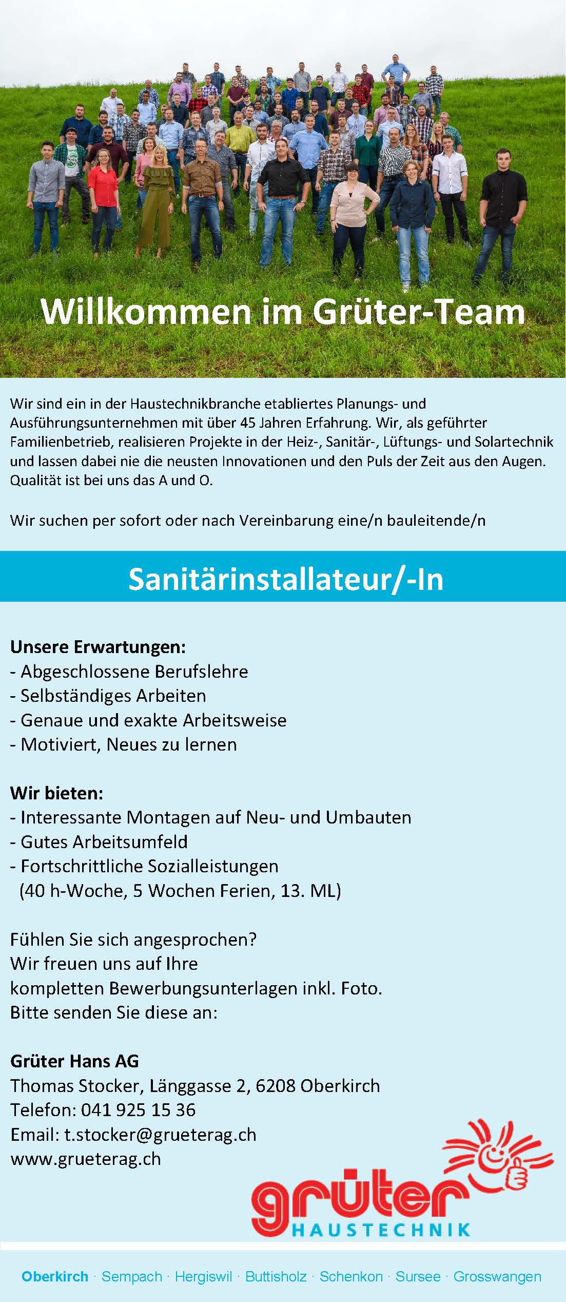 Mit rund 100 einheimischen Gebäudetechnikprofis bilden unsere Mitarbeiter die wichtigste Ressource. Wir geben ein motivierendes Umfeld, bieten eine partnerschaftliche Führung sowie fortschrittliche Sozialleistungen und wahren die Mitarbeiterinteressen. On top sorgt unser Grüter Plus+ Angebot für weitere Benefits!